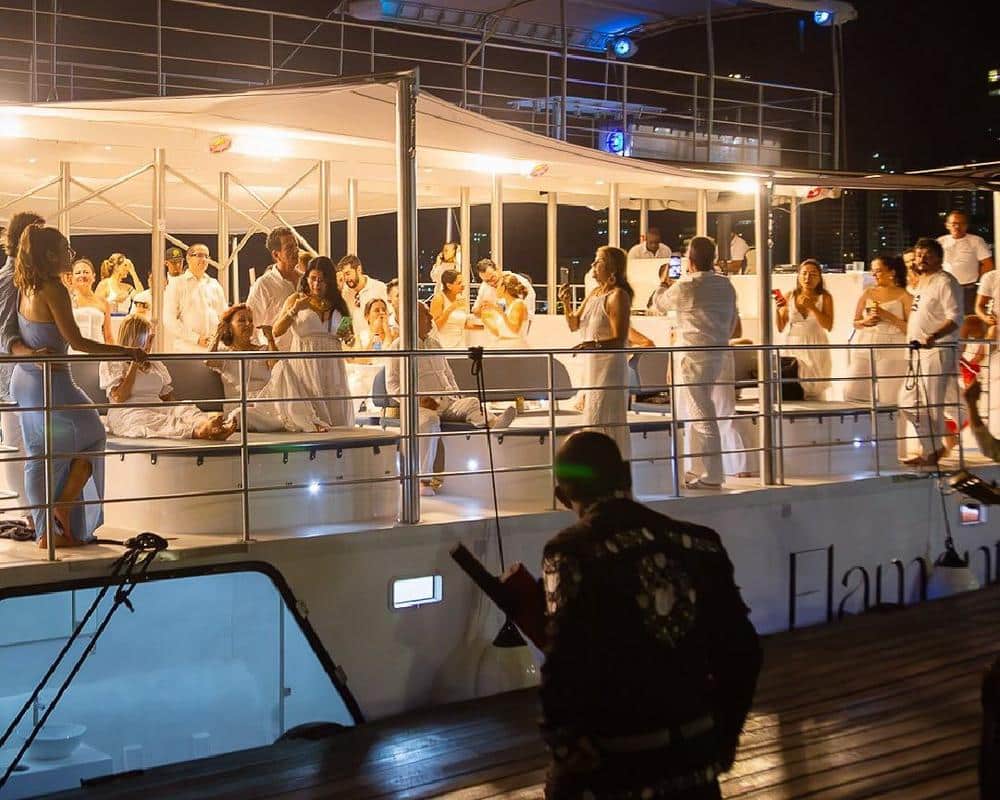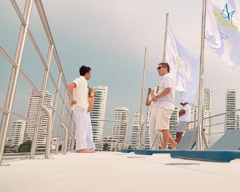 En el atardecer en crucero salimos del muelle de la Bodeguita, frente de la ciudad Amurallada de Cartagena. Navegamos entre los rascacielos de Manga y Bocagrande. Posteriormente, navegamos entre Isla Manzanillo y Castillo Grande. Llegamos delante de El Laguito y la isla Tierra Bomba, donde la bahÃa se abre al mar. Aquà abrimos las velas y disfrutamos de la magnÃfica puesta de sol mientras navegamos silenciosamente a vela. Poco a poco las luces de los rascacielos van iluminándose.